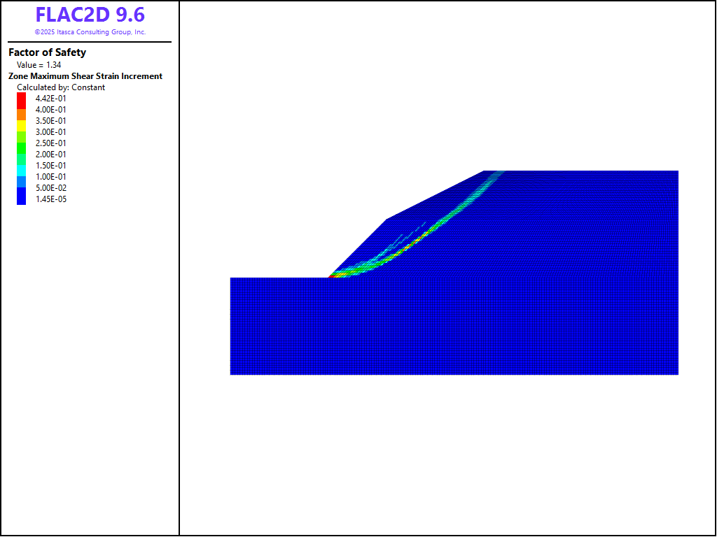 The calculated factor of safety is 1.38 and the failure surface develops as defined by a shear-strain contour plot shown in Figure 5. This surface closely matches the local minima surface shown for the FOS = 1.3848 failure surface in Figure 2. The failure state calculated by FLAC2D is the global minimum stability state.