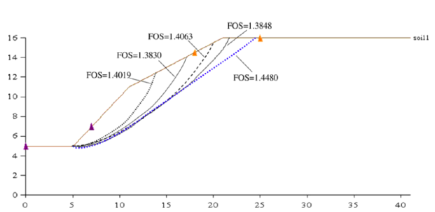 Figure 2: Local minima failure surfaces and factors of safety calculated by limit equilibrium method (from Cheng et al. 2007).