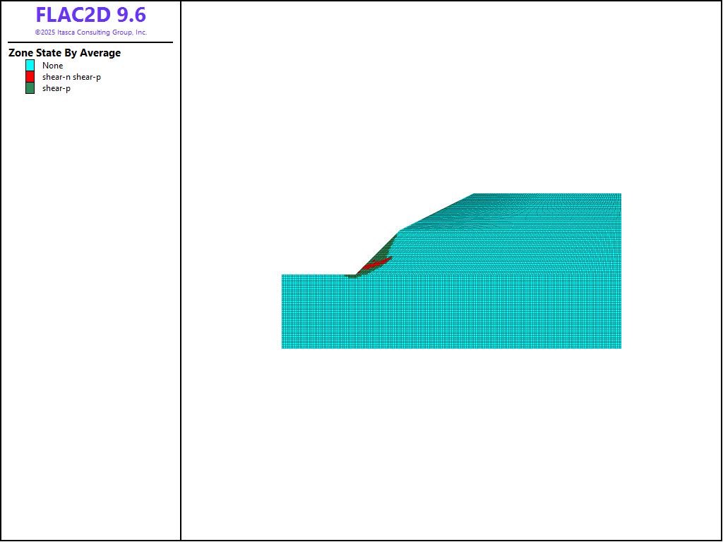 Gravity is applied, and the model is solved to an equilibrium state to establish the initial stresses in the model. Note that some isolated zones have reached a shear failure state at this stage, as indicated in the plasticity state plot shown in Figure 4. The slope is stable.