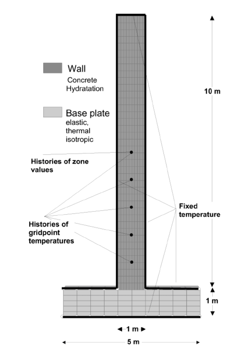 The thermal hydration model (hydration) and the mechanical hydration Drucker-Prager model (hydration-drucker-parger) are prescribed for the concrete wall. The base plate is considered elastic and thermally isotropic.