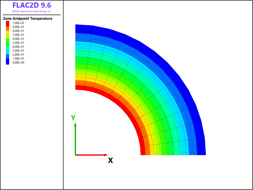 A thin quarter-section of the cylinder is modeled with FLAC2D. Figure 1 shows the FLAC2D grid. A constant-temperature boundary of 100°C is specified for the inner radius of the model; the temperature at the outer radius is specified to be 0°C.