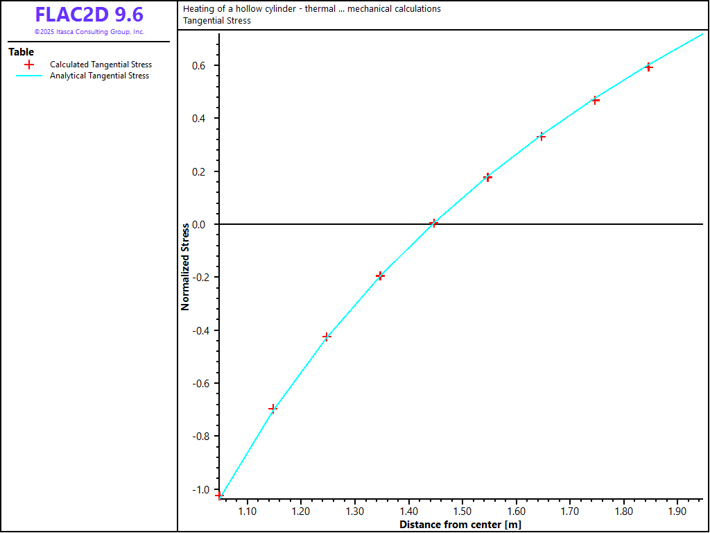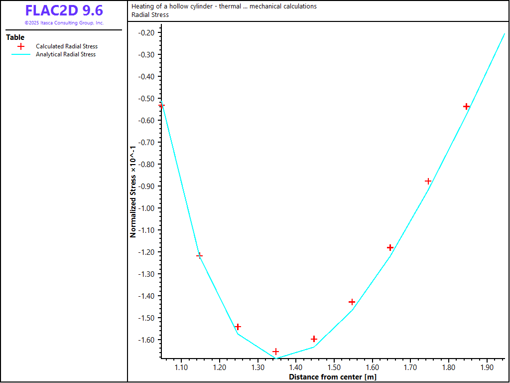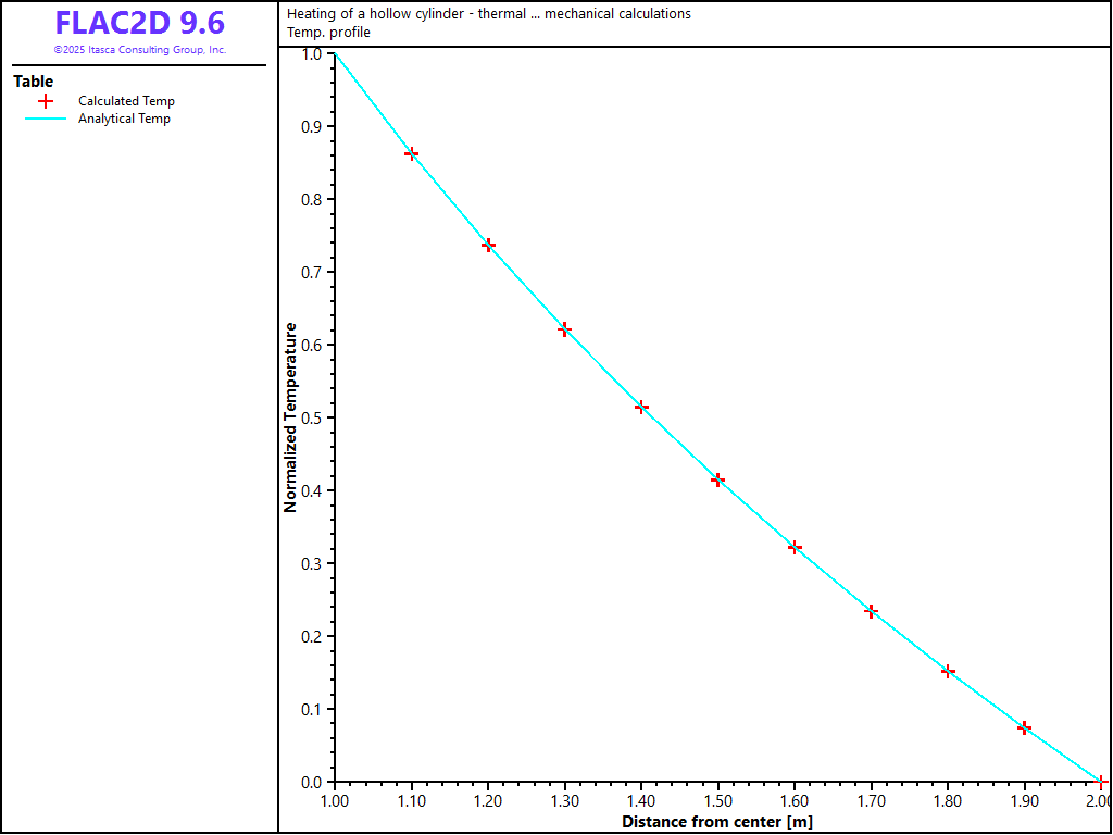The analytical solutions for temperature and stresses are programmed as FISH functions in the FLAC3D data file. The analytical and numerical results can then be compared directly in tables.