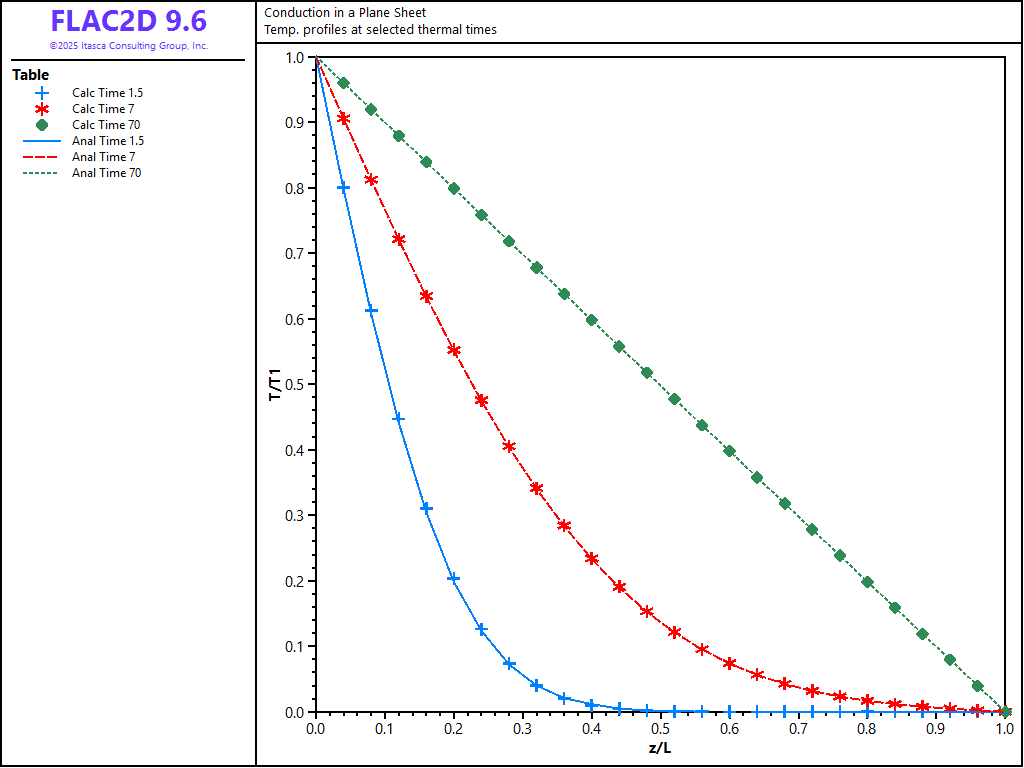 This example contains solutions solved by FLAC2D using both explicit and implicit formulations. The comparison of analytical and numerical temperatures at three thermal times for the explicit solution is shown in Figure 2, and that for the implicit solution in Figure 3. Normalized temperature (\((T(z,t)-T_2)/(T_1-T_2)\)) is plotted versus normalized distance (\(z/L\)) in the two figures, where Tables 2, 4, and 6 contain the analytical solution for temperatures, and Tables 1, 3, and 5 contain the FLAC2D solutions. The three thermal times are 1.5, 7, and 70 seconds for both the explicit and implicit solutions. The solution has reached the equilibrium thermal state by the last time in each case. For both solution formulations, the difference between analytical and numerical temperatures at steady state is less than 0.1%. Note that for the explicit solution, the timestep is approximately 0.07 seconds, while for the implicit solution, the timestep is set to 0.1 seconds.