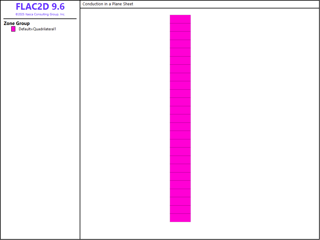 In the FLAC2D model, the sheet is defined as a column of 25 zones. A constant temperature boundary of 100°C is applied at the face located at y = 0, and a constant temperature boundary of 0 °C is applied at the face located at y = 1. The model grid is shown in Figure 1: