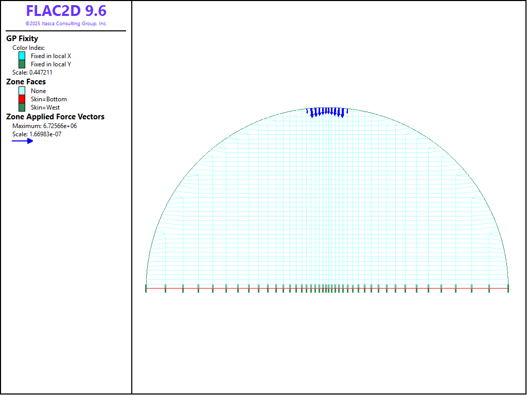 The zone face apply stress-normal command is used to apply the diametrical load as a normal stress. The boundary over which the pressure is applied is selected to correspond to the loading area defined by 2α. Two cases of loading area are studied: Case 1 corresponds to \(2α ≈13^°\); and Case 2 corresponds to \(2α ≈5^°\). The applied normal stress increases at a rate of 1.0 kPa per step. The load is increased to a level that is a few steps below the load at which failure initiates. The boundary conditions and applied forces for Case 1 at a normal stress of 14.244 MPa are shown in Figure 3. A FISH function, load, calculates the applied load, \(F\), and the horizontal stress, \(σ_θ^c\), at the center of the specimen. The analytical expressions are input in tables (11 and 12 in the data file) with the FISH function braz_analytical, and the FLAC2D results for \(σ_r\) and \(σ_θ\) through the specimen are stored in tables (21 and 22 in the data file) via the FISH function braz_num, for comparison purposes.