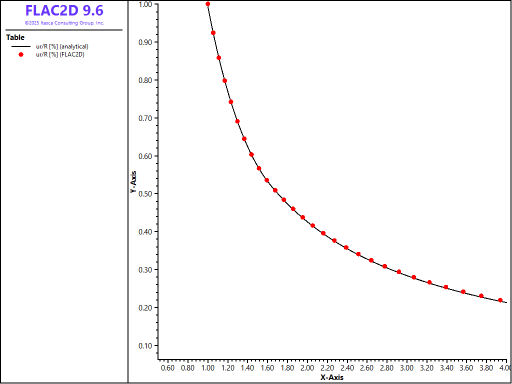 Figure 2 shows the radial and tangential stresses calculated by FLAC2D compared to the analytical solution for \(\sigma_r\), and \(\sigma_\theta\). Figure 3 compares radial displacement, \(u_r\). The agreement is very good in both comparisons.