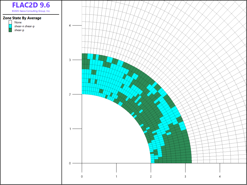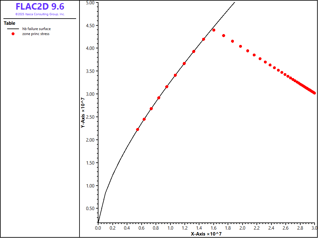 A plot of the Hoek-Brown failure envelope is shown in Figure 4. Zone stresses (\(\sigma_1\) vs. \(\sigma_3\)) shown on this plot indicate the amount of plastic failure in the model. Figure 5 displays the zone plasticity indicators, which also indicate the extent of the failure region. This corresponds to the analytical solution of 3.2 m (1).