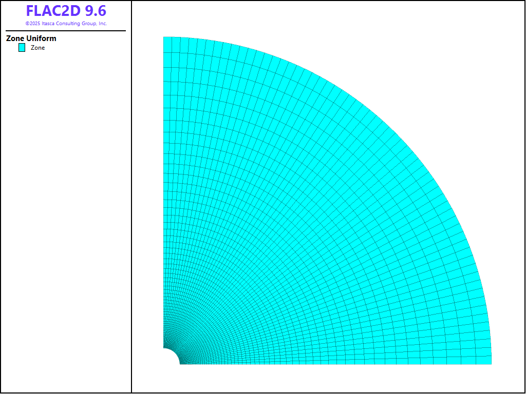 Because of symmetry, only a quarter of the problem requires analysis. The grid is shown in Figure 1. As the figure indicates, it is a radially symmetric mesh with increasing zone size away from the hole. The grid contains 3600 zones, and the boundary is located at 20 radii from the center of the hole. The constitutive model used for the simulation is the Hoek-Brown-PAC model.