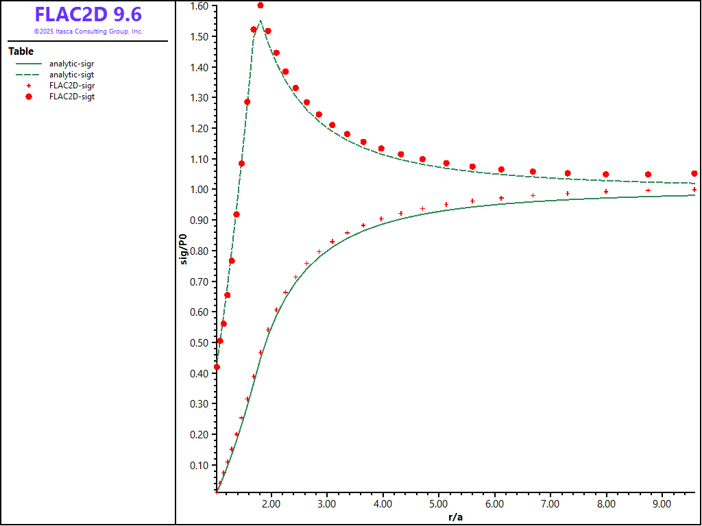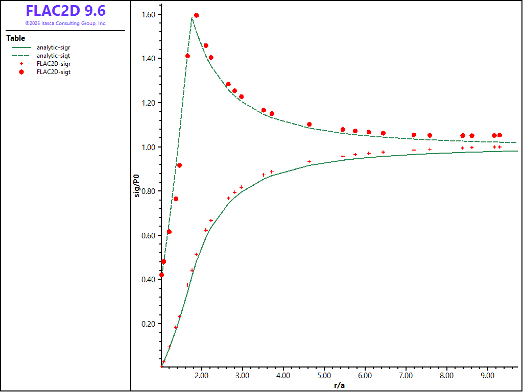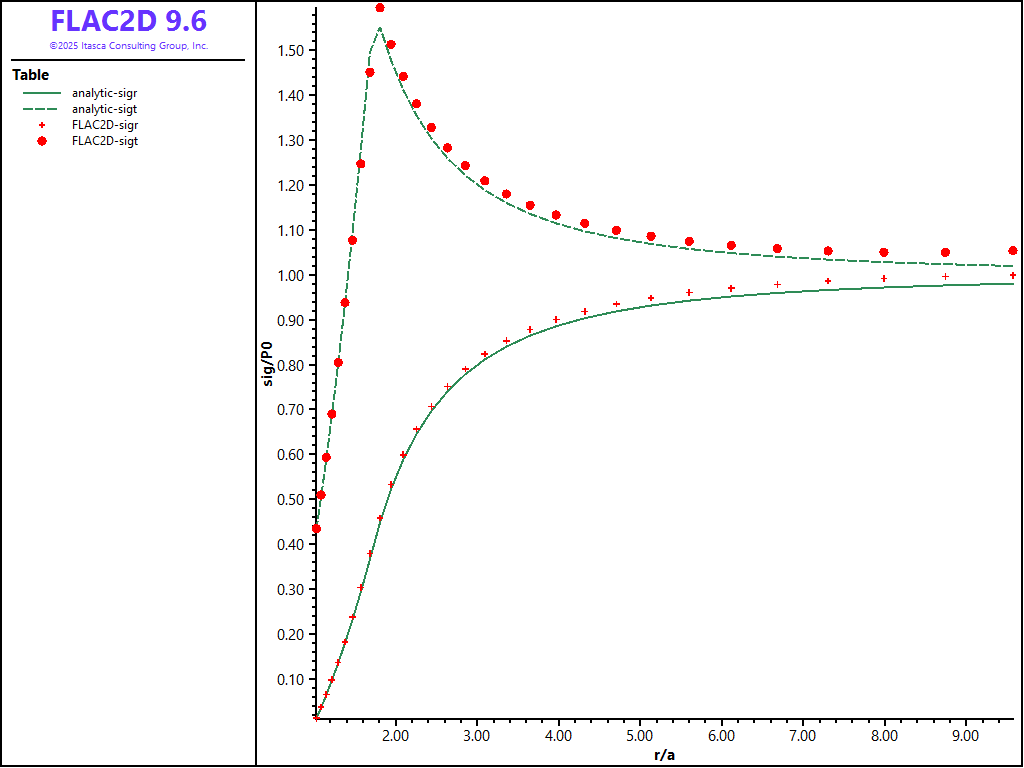 nastrcalculates (i) numerical and corresponding analytical values of \(-{\sigma}_r/P_0\) and \(-{\sigma}_{\theta}/P_0\) at the centroid of zones closest to the \(x\)-axis; and (ii) average relative error of \(-{\sigma}_r/P_0\) and \(-{\sigma}_{\theta}/P_0\) throughout the grid.
