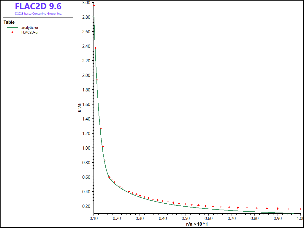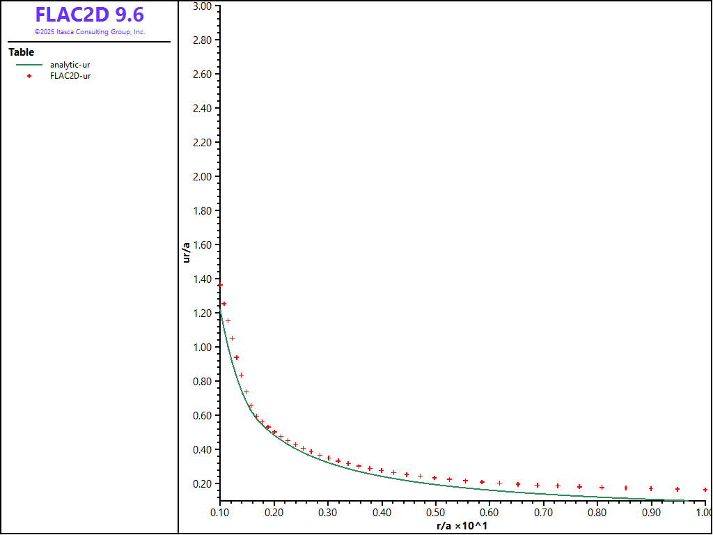 Figure 2 through Figure 5 show comparisons between FLAC2D results and the analytic solution along a radial line. Normalized stresses, \(-{\sigma}_r/P_0\) and \(-{\sigma}_{\theta}/P_0\), are plotted versus normalized radius, \(r/a\), in Figure 2 and Figure 3, while normalized displacements, \(-u_r/a\), are represented versus \(r/a\) in Figure 4 and Figure 5.