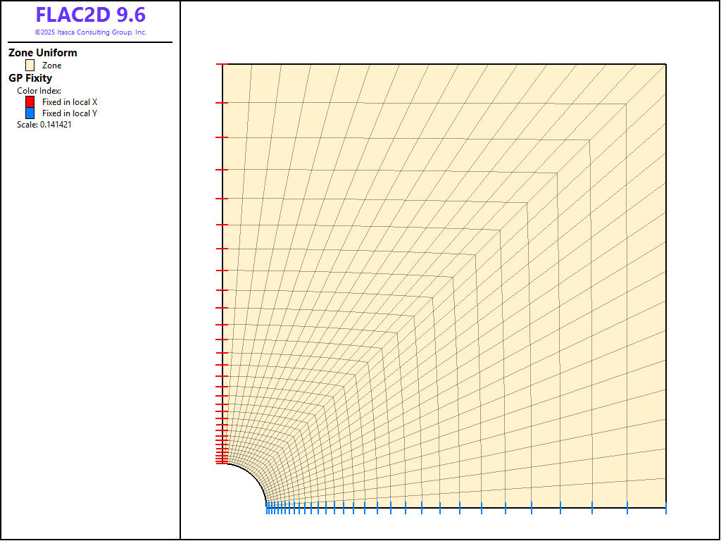 Figure 1: Domain, grid, and boundary conditions for FLAC2D simulation—quarter symmetry.