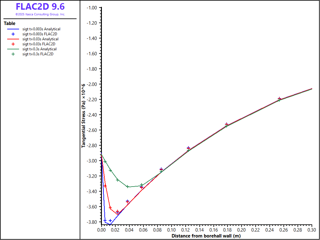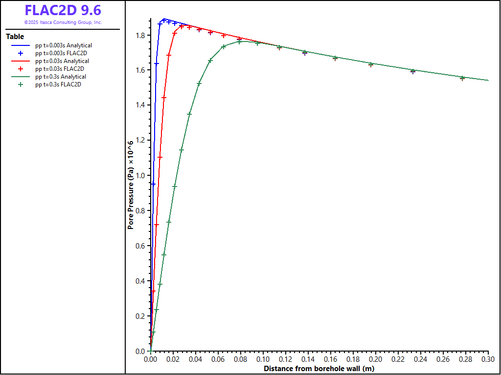 The superposition of the three loading mode solutions is performed in three FISH functions “stor_pp”, “stor_sigt” and “stor_ur” to provide solutions for pore pressure, tangential stress and radial displacement, respectively, for comparison to the FLAC2D results. Note that the FISH function “ERFC.FIS” is used to calculate the complementary error function.
