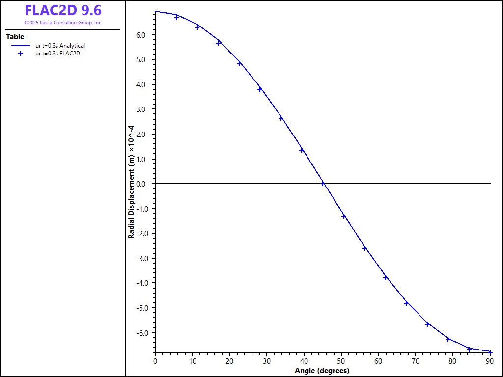 The radial displacement versus θ is compared to the analytical solution in Figure 5 for a simulation time of 0.3 second. The results of the FLAC2D simulation show good agreement with the analytical predictions.