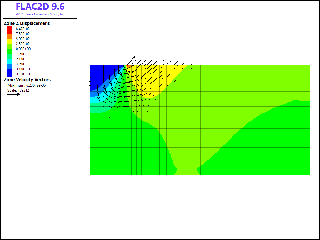 For the initial model with structured grid, the domain is discretized into 520 zones organized in a graded pattern, as seen in Figure 3, with the grading arranged to increase zone density in the areas of high strain gradient. The area representing the footing extends six zones laterally, and a velocity of magnitude 0.5 × 10-5 m/step is applied at the contact nodes for a total of 25,000 calculation steps.