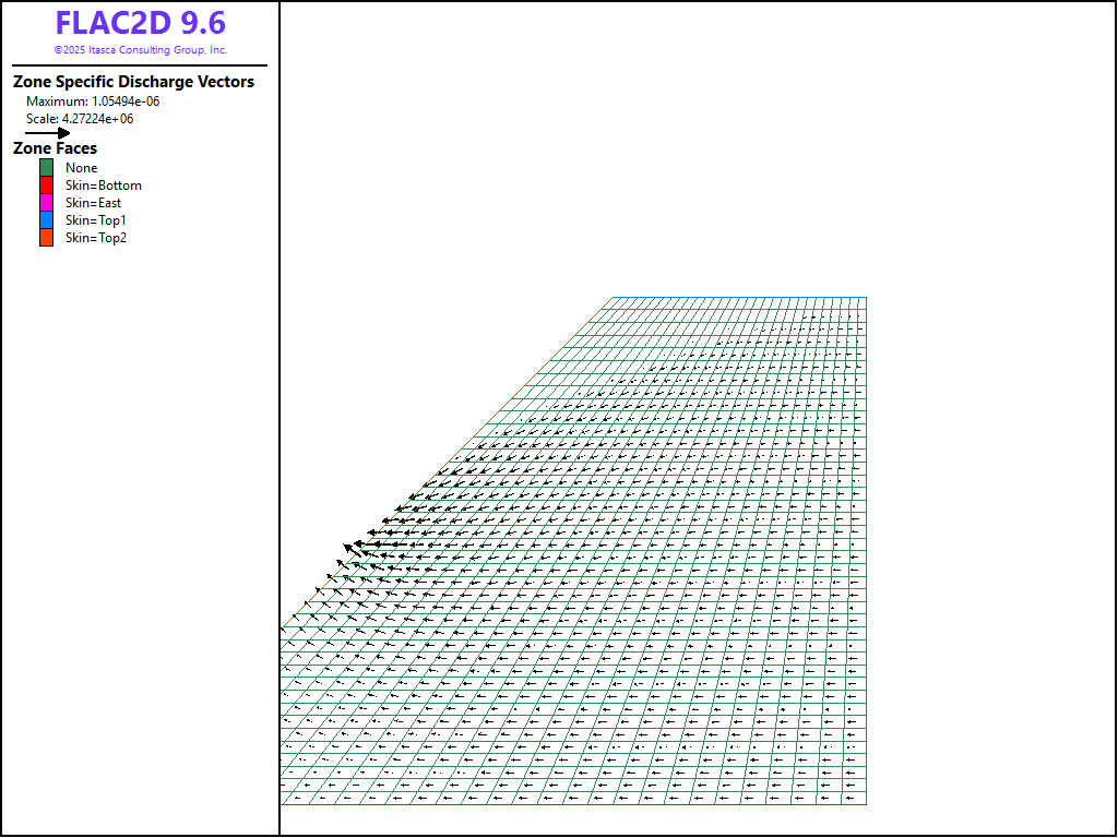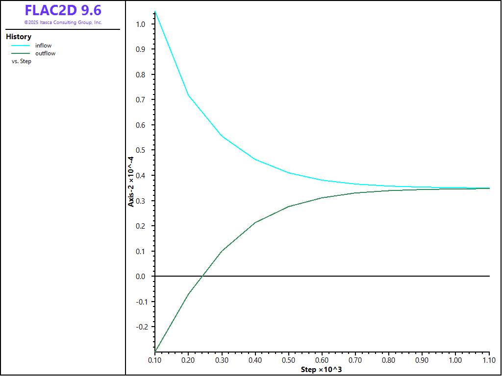 The model solve-fluid command with a value of ratio-flow equal to 5e-3 is used to cycle the model to steady state. The evolution of the model is monitored using the FISH function “flow” , which calculates inflow and outflow at the fixed pore-pressure boundaries. At steady state, the free surface is a streamline,and inflow is equal to outflow.