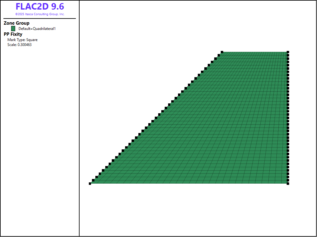 The material properties are assigned as described above. Because only the length of the seepage face under steady-state flow conditions is of interest, the actual values of the mechanical properties and homogeneous permeability are irrelevant.
