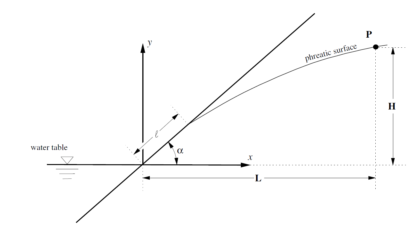 The purpose of this problem is to determine the length of the seepage face \(l\),in an inclined riverbank, knowing the location of a point, \(P\) , on the phreatic surface. The slope of the riverbank is at angle \(α\). The location of point \(P\) is defined by distances \(L\) and \(H\). Figure 1 illustrates the geometry. For this problem:.