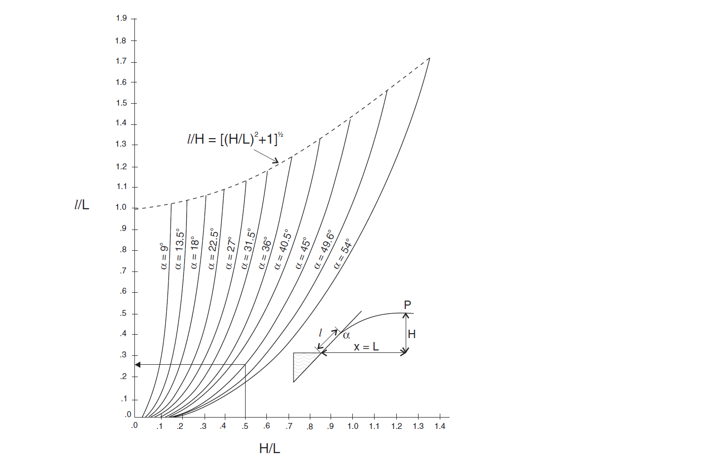 The solution is presented in the form of a chart given in Figure 2. This chart plots \(l/L\) as a function of \(H/L\) for different values of α. For this particular problem, \(H/L = 0.5\) and \(α = 45◦\), so \(l/L = 0.255\) and, since \(L = 100 m\), the length of the seepage face is \(l = 25.5 m\).