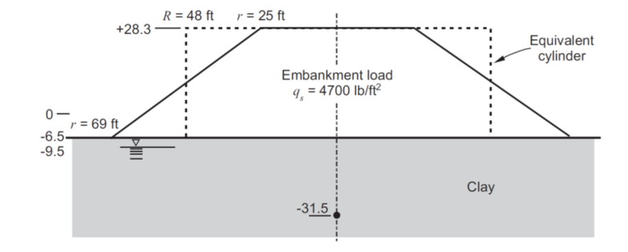 Figure 1: Embankment on clay foundation (from Lambe and Whitman 1969, Figure 26.14).