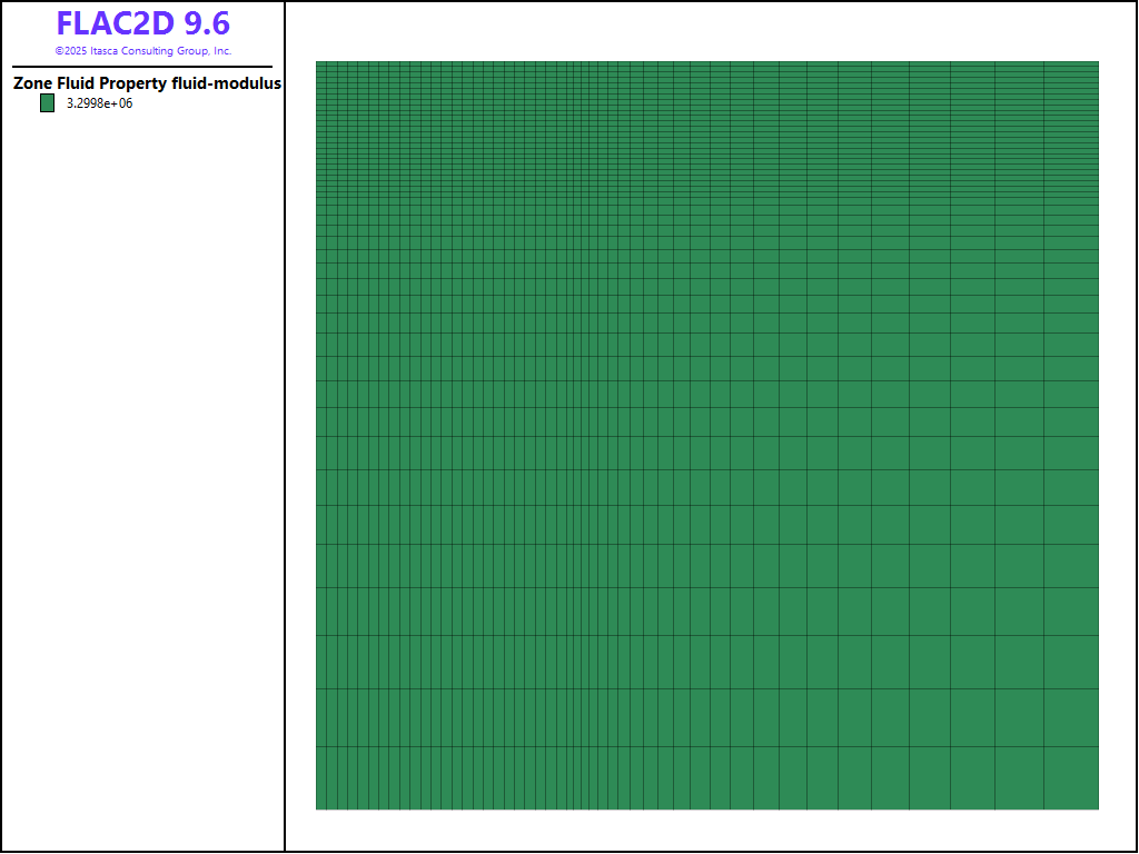 where \(n\) is the porosity, and \(K\) and \(G\) are the bulk and shear moduli of the unsaturated soil. This calculation is performed automatically and the fluid modulus is set with the command zone fluid modulus-automatic. In this model the calculated \(K_w\) is 3,300,000 psf.