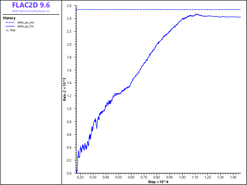 A FISH function, pphist_ini, stores the initial values for total stress and pore pressure before loading, and another function, pphist, monitors the change in total stress and pore pressure resulting from the applied load. These FISH variables are then recorded as histories for comparison to the Lambe and Whitman values.