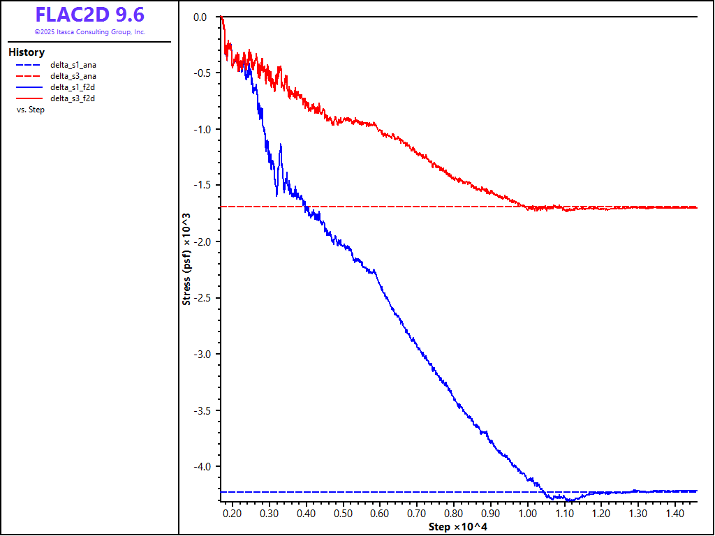The comparison of the FLAC2D solution to the Lambe and Whitman solution for the total principal stress change due to the embankment loading is illustrated in Figure 3. The final FLAC2D value for :math:Delta sigma_1 is within 0.52% of the Lambe and Whitman solution, and the value for \(\Delta \sigma_3\) is within 2.5%.