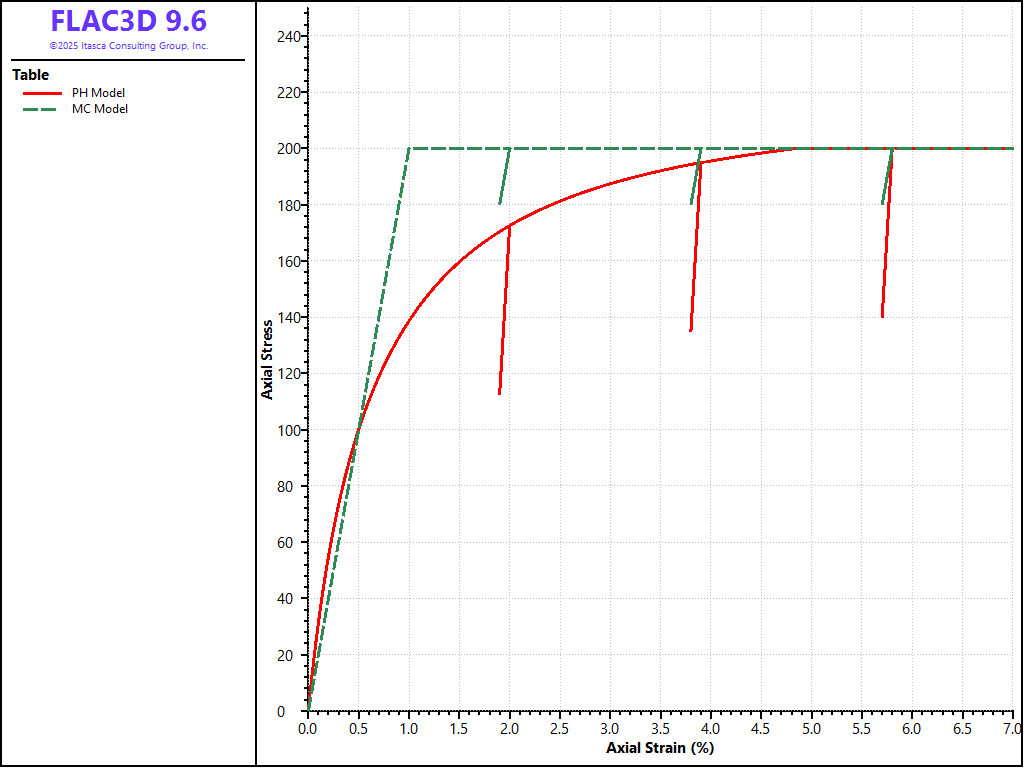 Figure 1 shows a plot deviatoric stress versus axial strain for both PH and MC models. It is easy to verify the following from the figure: