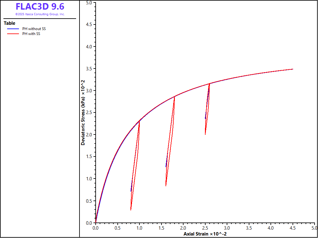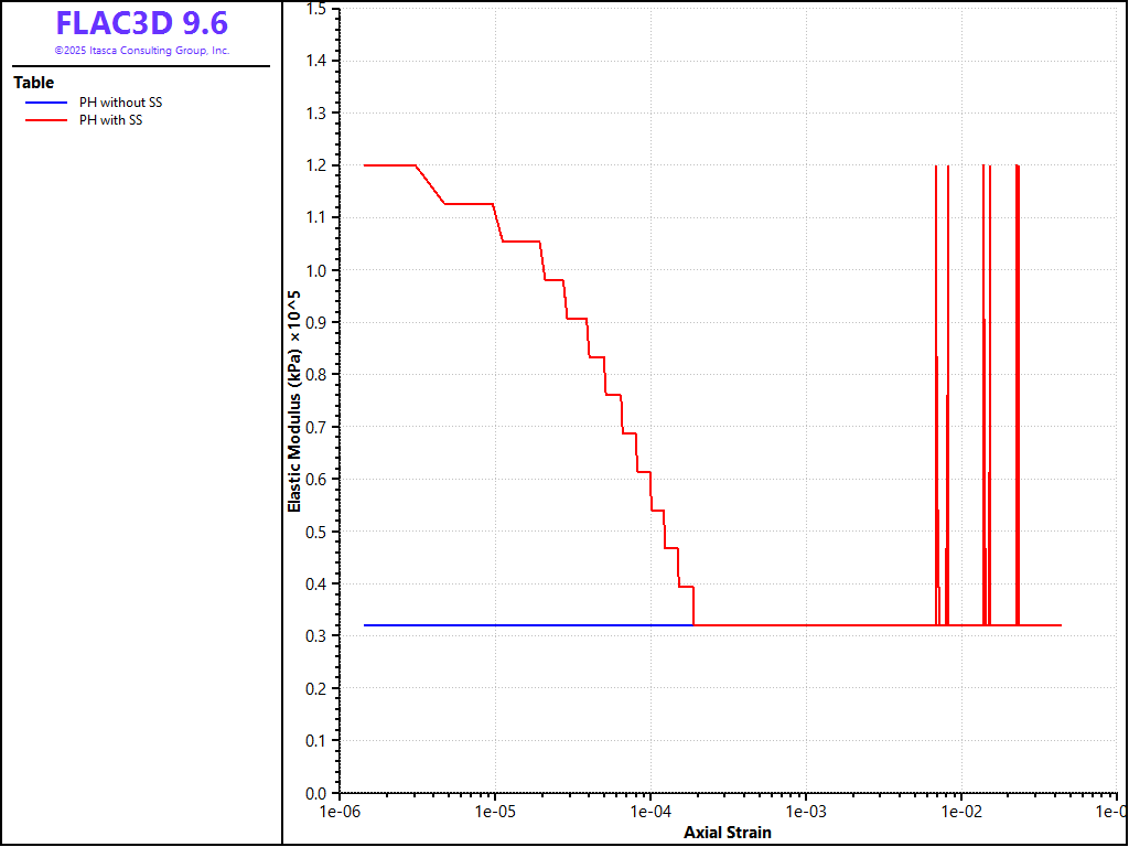 This example compares the behavior of the Plastic-Hardening (PH) model without and with small-strain stiffness during triaxial compression. Both models comprise a one-zone triaxial compression test with a constant cell pressure of 100 kPa. Case 1 is the standard PH model without small-strain stiffness, and Case 2 is the PH model with small-strain stiffness. The parameters are listed in Table 1.