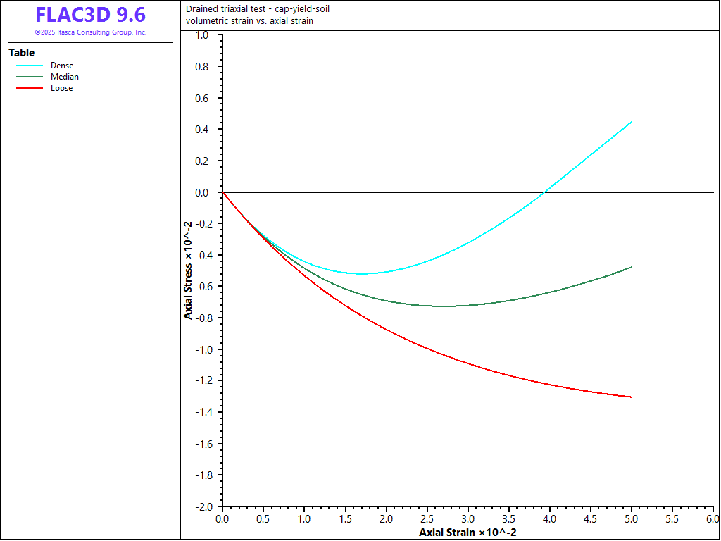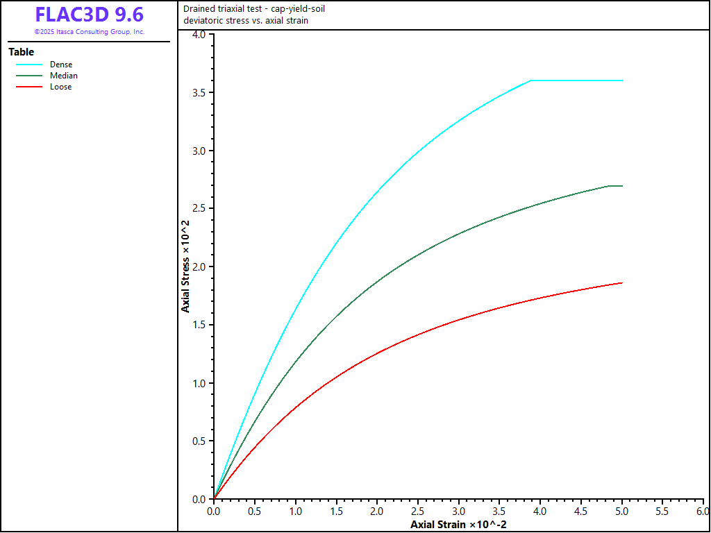 The simulations of drained triaxial test with constant dilation are repeated here by with dilation hardening, this time also using a dilation hardening law as described in the dilation hardening section of the CYSoil model. Initial dilation is zero, and the ultimate values of dilation are 10, 5, and 0 degrees for dense, medium, and loose sand, respectively. Test results for all three cases are written to table files.