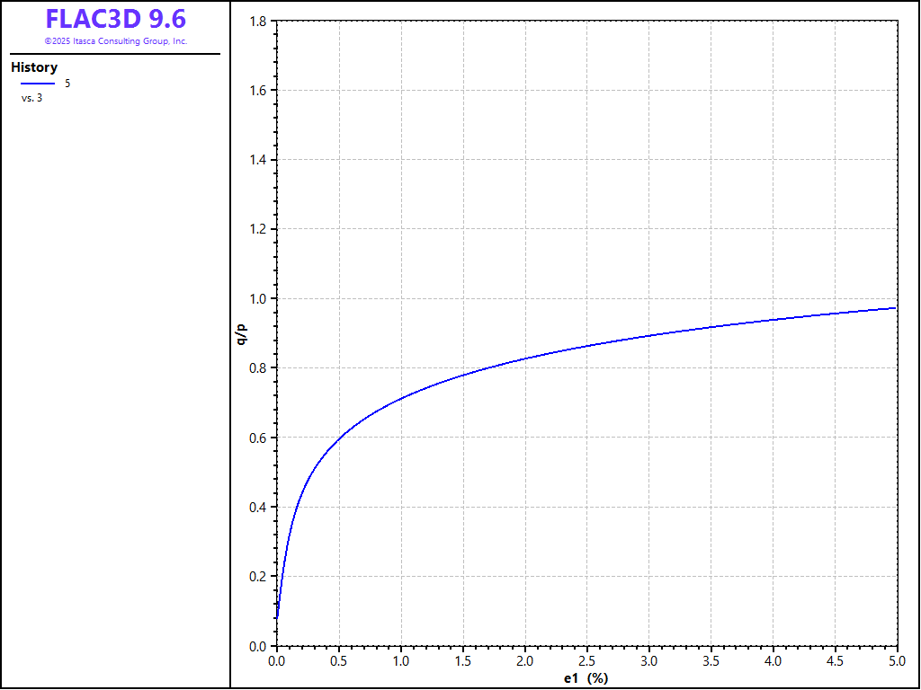 Figure 1: Simulation of \(q/p\) vs. axial strain for drained triaxial tests for \(e_0\) = 0.59 and \(p_0\) = 130 kPa.