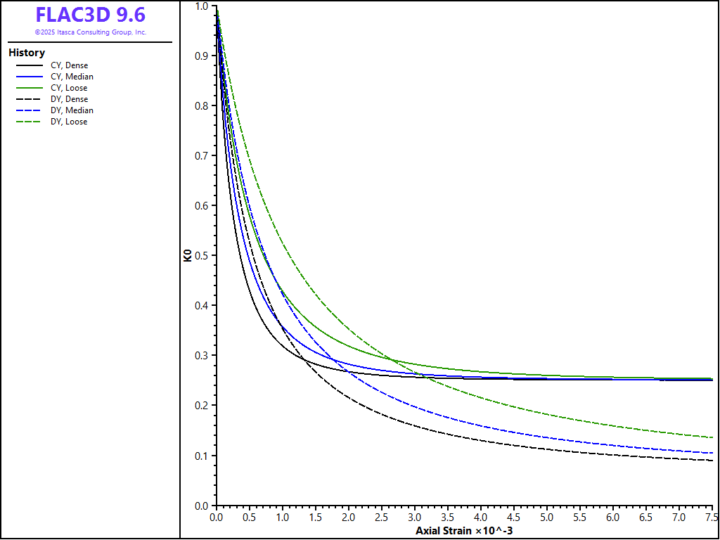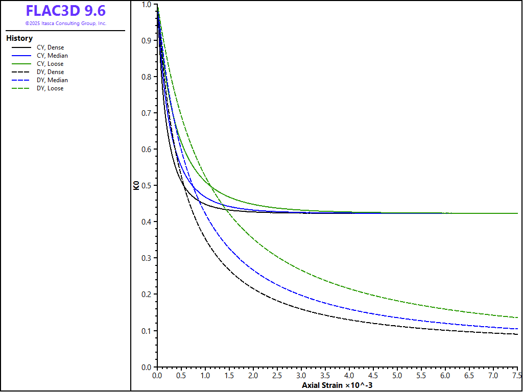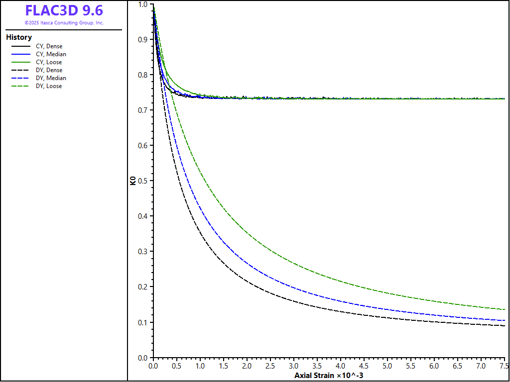 The results of the oedometer simulations show that, with the given properties, a higher value of \(K_0\) is achieved for the CYSoil model than the double-yield model. And for all tests, the lower the aspect ratio of the cap, the higher the \(K_0\) that is achieved. Also, dense, medium, and loose sands converge to the same ultimate \(K_0\) value as deformation takes place, and they do so at a faster deformation rate for the CYSoil model than the double-yield model.