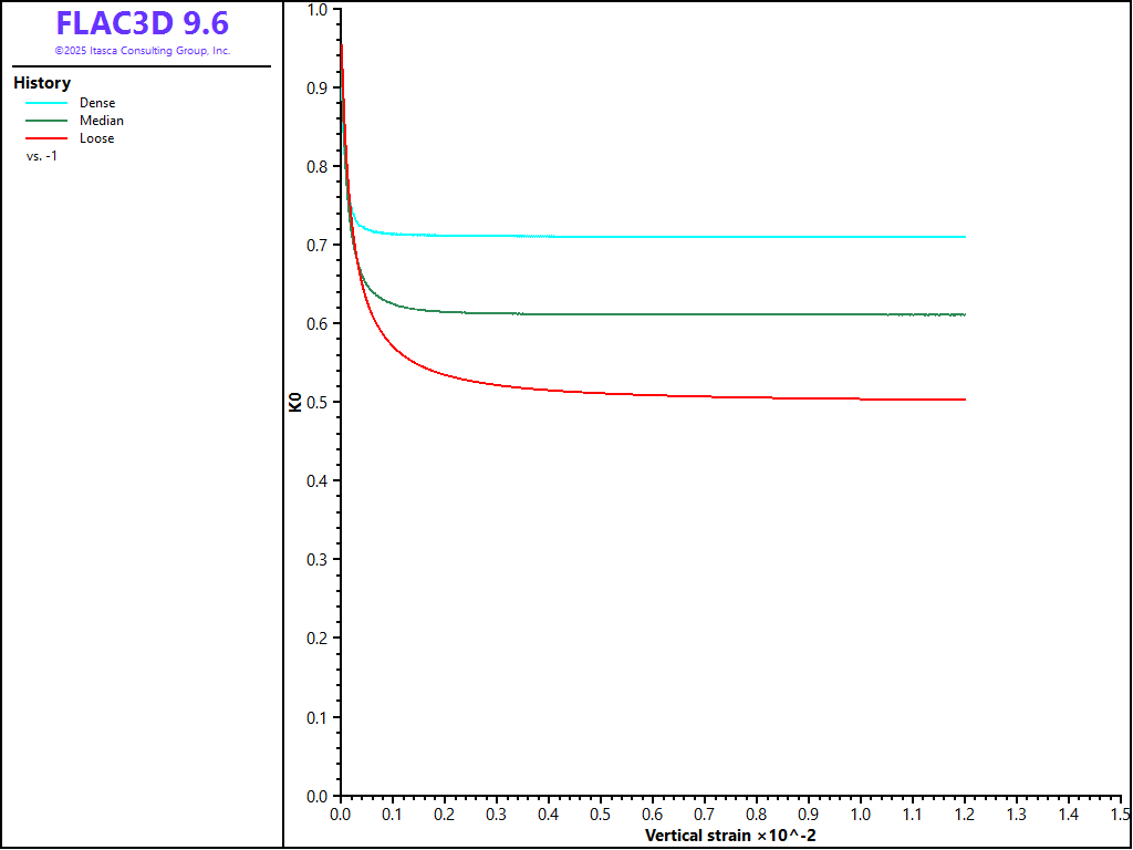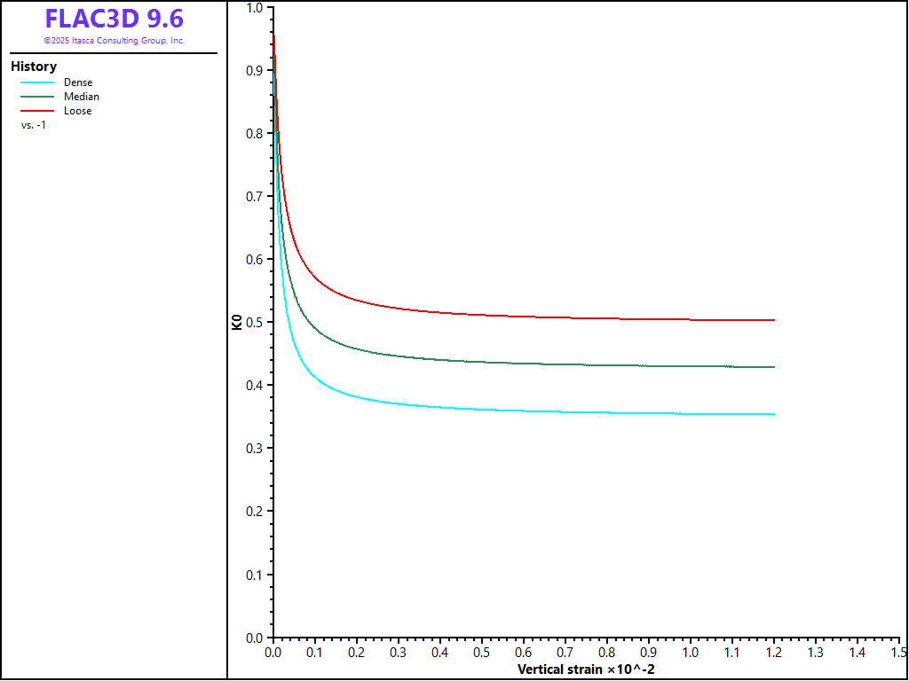 This section presents the simulation of an oedometer test to reveal the capability of the Plastic-Hardening (PH) model to reproduce the evolution of lateral stress ratio \(K_0 = \sigma_h/\sigma_h\). Three kinds of sands with friction angles of 30, 35, and 40 degrees are used in the simulations of this case (Case 1) and the default consolidation coefficient is calculated as \(K_{nc} = 1 − \sin \phi\). The model properties are listed in Table 1. The properties not listed in the table are using the default values. Initially the model is in equilibrium with isotropic stress state in each zone, \(\sigma_1\) = \(\sigma_2\) = \(\sigma_3\) = −1 kPa.