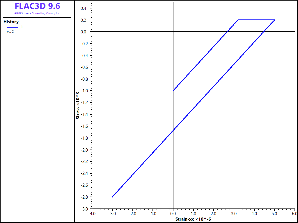 Figure 2 shows the stress versus strain in the zone in the \(x\)-direction during the compression phase of the test. As expected, the compressive stress is not developed until the crack is closed. After the crack is closed, the stress-strain path then is along the reversed direction of loading. When querying the zone parameters, the number of cracks is still 1, and crack number 1 (unit normal direction) is still (1,0,0). The overlapped loading and unloading paths in Figure 3 show that the model tensile cracking is fully reversible and that compressive stresses do not develop until the crack is closed. Figure 3 shows the complete stress versus strain path of loading and unloading.
