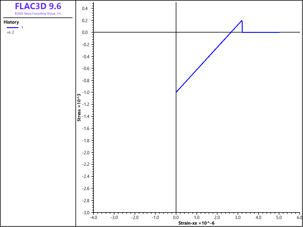 Figure 1 shows the stress versus strain in the zone in the \(x\)-direction during the zone extension. As the strain is changing from zero to 5×10-6, the stress is changing from the initial -1000 Pa to the tension limit of 200 Pa and then suddenly drops to zero because the crack occurs when the stress reaches the tension limit. The stress in the loading direction remains zero during the further extensional strain. When querying the zone parameters, the number of cracks (number-cracks) is 1, and the unit normal direction for crack number 1 is (1,0,0).