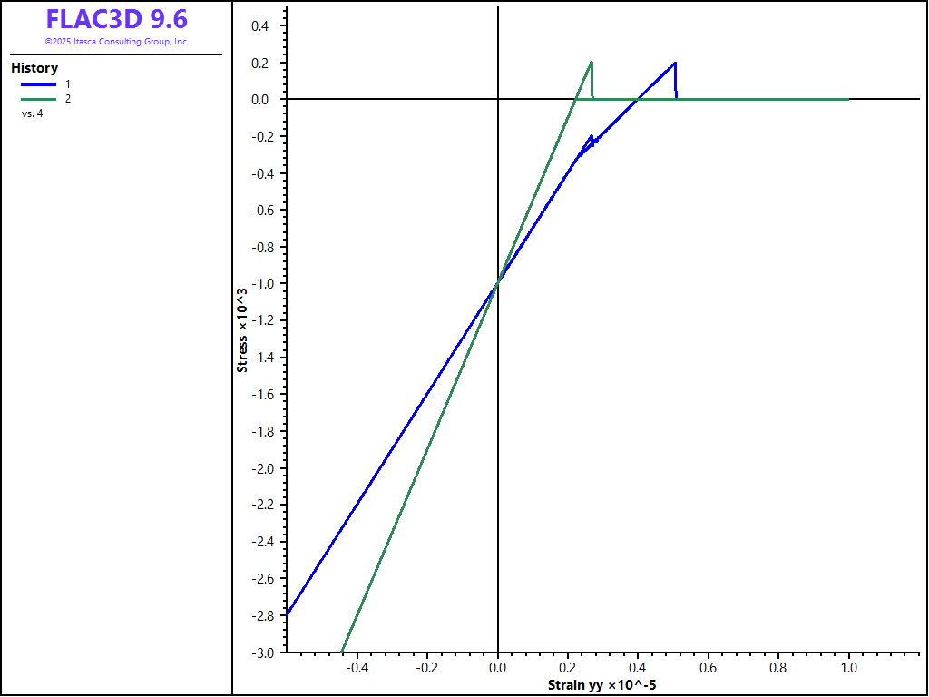 A comparison showing the complete stress versus strain path of loading and unloading is plotted in Figure 8 when the model is changed to the traditional Mohr-Coulomb model. This example also confirms the reversibility of the tensile cracking in the MohrT model.