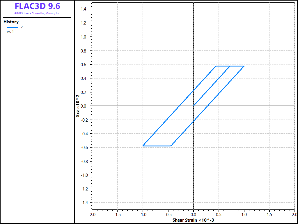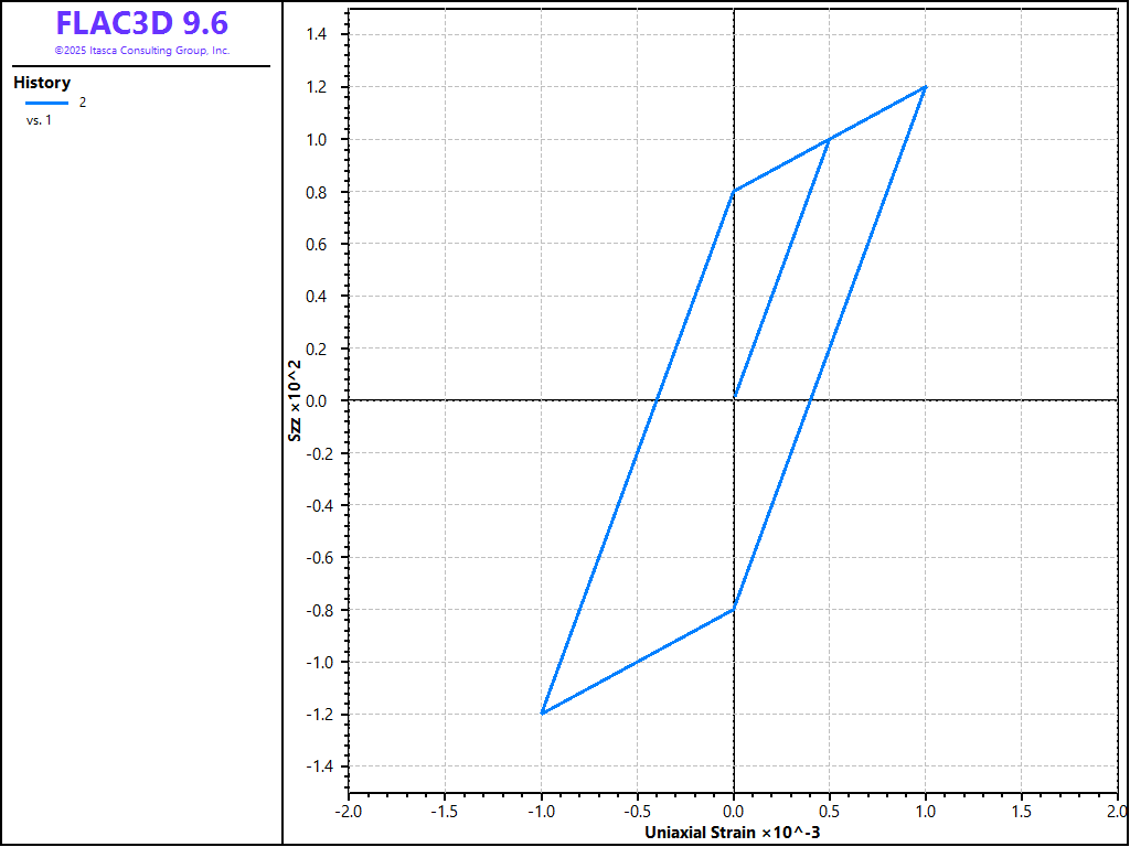 In this example to test the von-mises model, a 1 m x 1 m single zone is generated, and the following elastic material properties are assigned: Young’s modulus \(E\) = 2 x 105 Pa, Poisson’s ratio \(\nu\) = 0.2, and yield strength \(\sigma_Y\) = 1000 Pa. The properties are listed in Table 1.