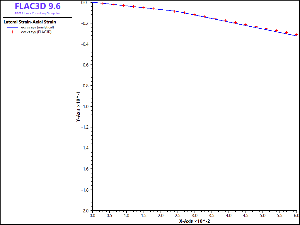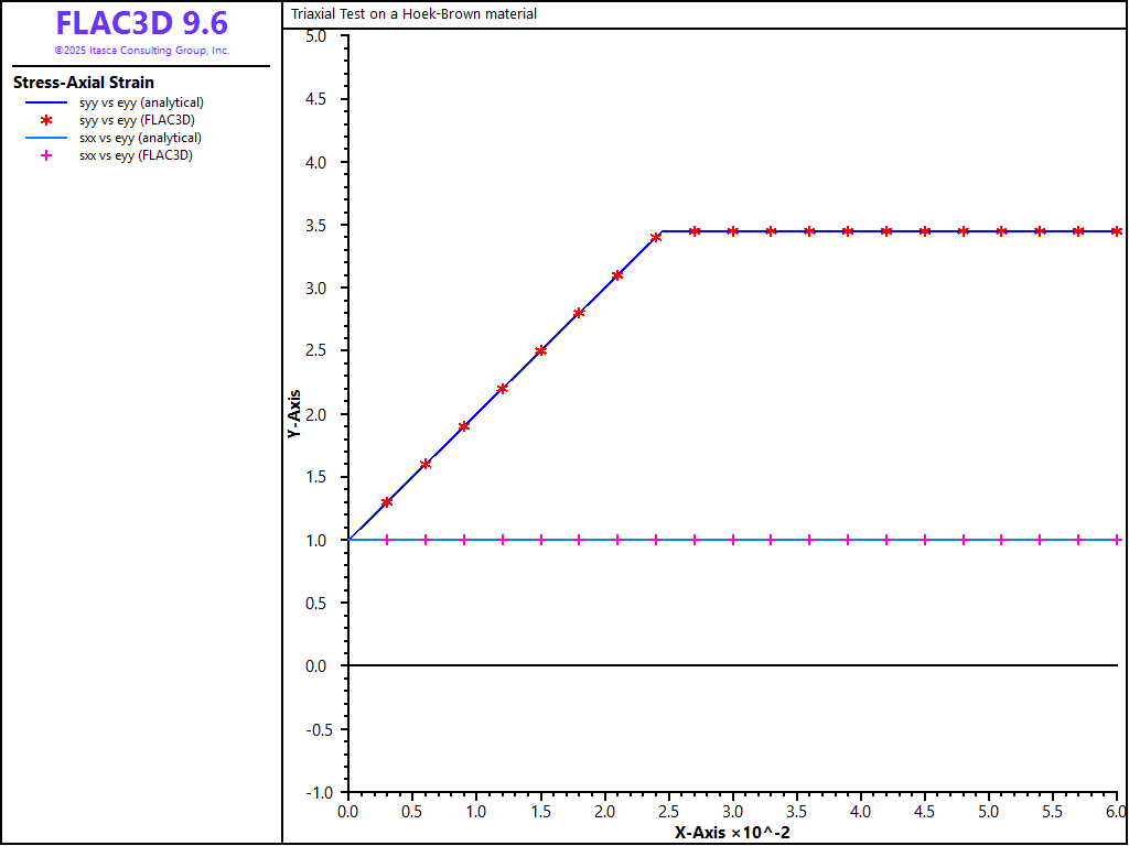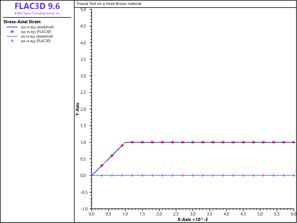 The FLAC3D results for the zero confining stress case are compared to the analytical solution (see Triaxial Compression Test with Hoek-Brown-PAC Model) in Figure 1 and Figure 2, and the results for the high confining stress case are compared in Figure 3 and Figure 4.