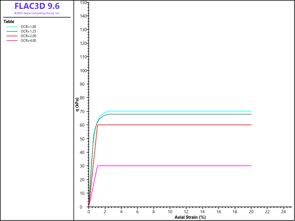 The Soft-Soil model is used to simulate the triaxial consolidated-undrained (CU) tests with the consolidated stresses at 100, 80, 50, and 25 kPa. The pre-consolidated pressure (cap pressure) is assumed 100 kPa for all four cases, which corresponds to OCR = 1.00, 1.25, 2.00, and 4.00, respectively. The triaxial undrained compression is realized by setting zero volumetric strain, or the horizontal strains are setting to -0.5 times of the axial strain. The axial strain is up to 20%. The input parameters are summarized in the table: