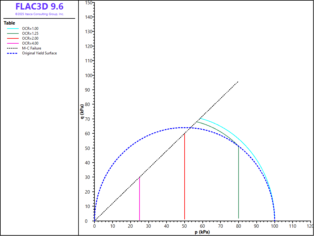 From Figure 2, for the case of OCR = 1, p is decreasing immediately after the undrained triaxial loading until it hits the Mohr-Coulomb shear failure line and the cap is expanding when q is increasing. For the case of OCR = 1.25, p remains constant until it reaches the cap; then p decreases until it reaches the Mohr-Coulomb shear failure line. For the cases of OCR = 2 and 4, p remains constant because the load paths reach the Mohr-Coulomb shear failure line before the cap. For the last two cases, the high OCR values prevent the undrained loading paths from reaching the cap.