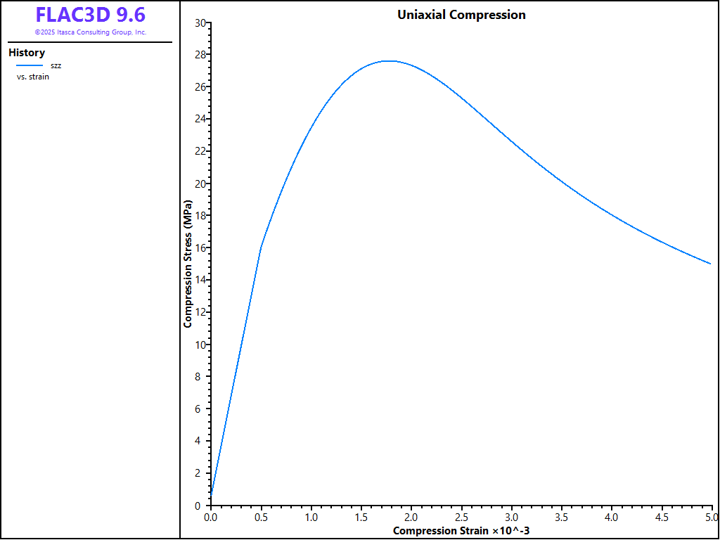 The first test is the uniaxial compression loading. the numerical result is shown in Figure 1. The numerical model correctly duplicated the whole loading, which can be verified by the elastic slope (Young’s modulus), initial and peak compression yield stress.