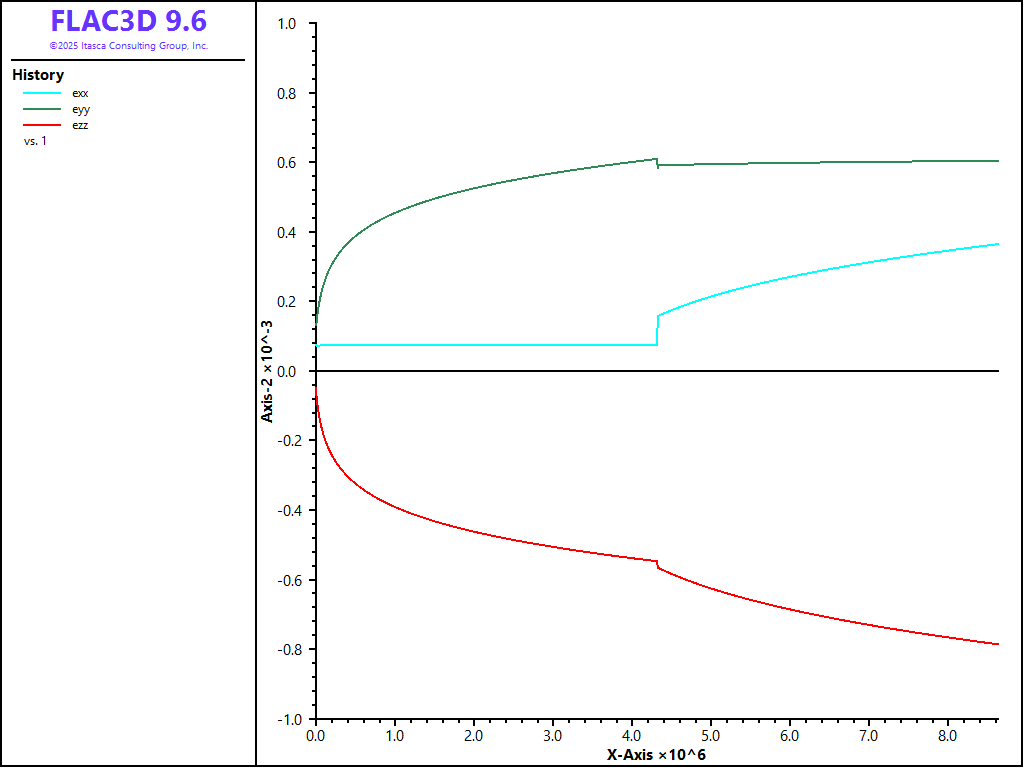 The test starts with zero stress. At t = 0 days, the stresses applied are \(\sigma_{xx} = 3.5\) MPa, \(\sigma_{yy} = 5\) MPa, and \(\sigma_{zz} = 0\) MPa. At t = 50 days, σ_xx is increased to 6 MPa, while the other stresses remain unchanged. This significant increase in σ_xx induces a step change in elastic strain, noticeable due to the minimal viscoplastic strains at these low levels of equivalent stress. Throughout the test as presented in Figure 1, the numerical results from FLAC3D and the reference analytical solutions in Reedlunn (2018) for the three total strains exhibit an exceptionally good match.