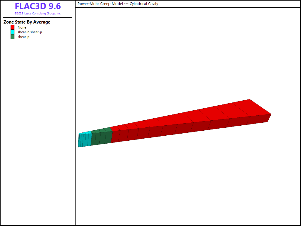 The model geometry, material properties, and initial and boundary conditions are the same as those used in Power Model: Cylindrical Cavity. The numerical simulation is performed in three stages. In the first stage, the cohesion is set to a high value and the model is run to elastic equilibrium. In the second stage, the actual values for cohesion, friction, and dilation are assigned to the zones, and the new equilibrium state is calculated. The velocities are reset to zero before performing the creep calculation (stage 3).