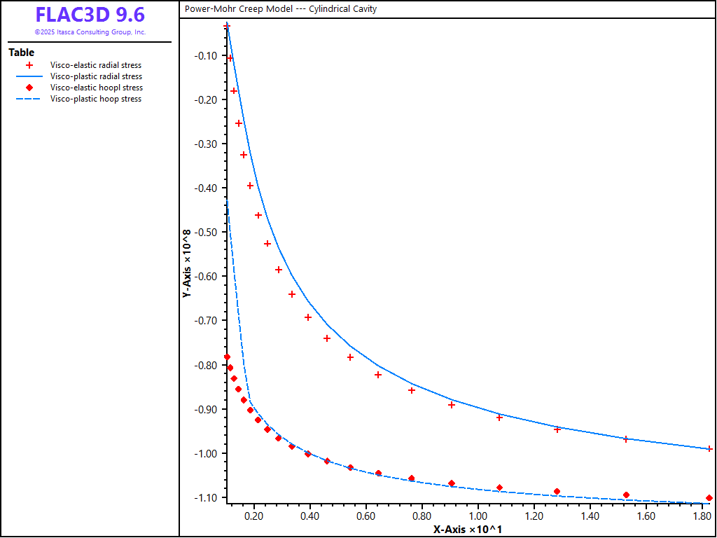 The problem of radial creep of an infinitely long, thick-walled cylinder, presented in Power Model: Cylindrical Cavity, is analyzed again in this example, this time considering a viscoplastic material. The material viscous behavior is characterized by a single-component power law, and the plastic behavior by a Mohr-Coulomb yield criterion. The plastic properties of the material are associated, the cohesion is 15 MPa, and the friction angle is 15 degrees. The steady-state solution is compared to the analytical solution for a viscoelastic material obeying the same viscous law (see Power Model: Cylindrical Cavity).