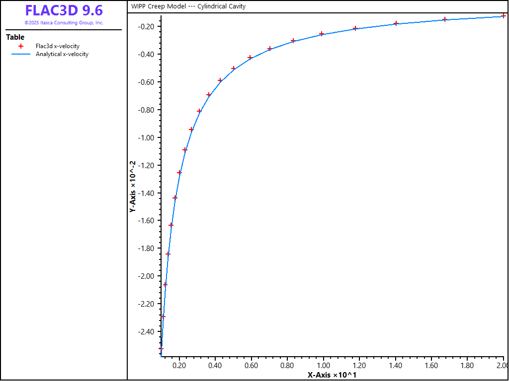 The WIPP-reference creep model in FLAC3D is used to solve the problem of radial creep of an infinitely long, thick-walled cylinder subjected to a pressure on its outer surface. The analytical steady-state solution, assuming that creep is defined by a single-component power law, is provided in Power Model: Cylindrical Cavity. The WIPP model can be converted to a power law formulation by using only the secondary creep-strain component. This is achieved by setting the WIPP properties a\_wipp and b\_wipp to zero. The WIPP model is then reduced to the form