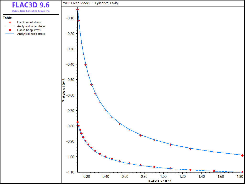 The results of this example are summarized in Figure 1 and Figure 2. Figure 1 compares the analytical solution for the radial velocity in the steady-state condition with the FLAC3D results. Figure 2 shows the comparison of radial and hoop stresses. The agreement between results is similar to that for the power law test in Power Model: Cylindrical Cavity.