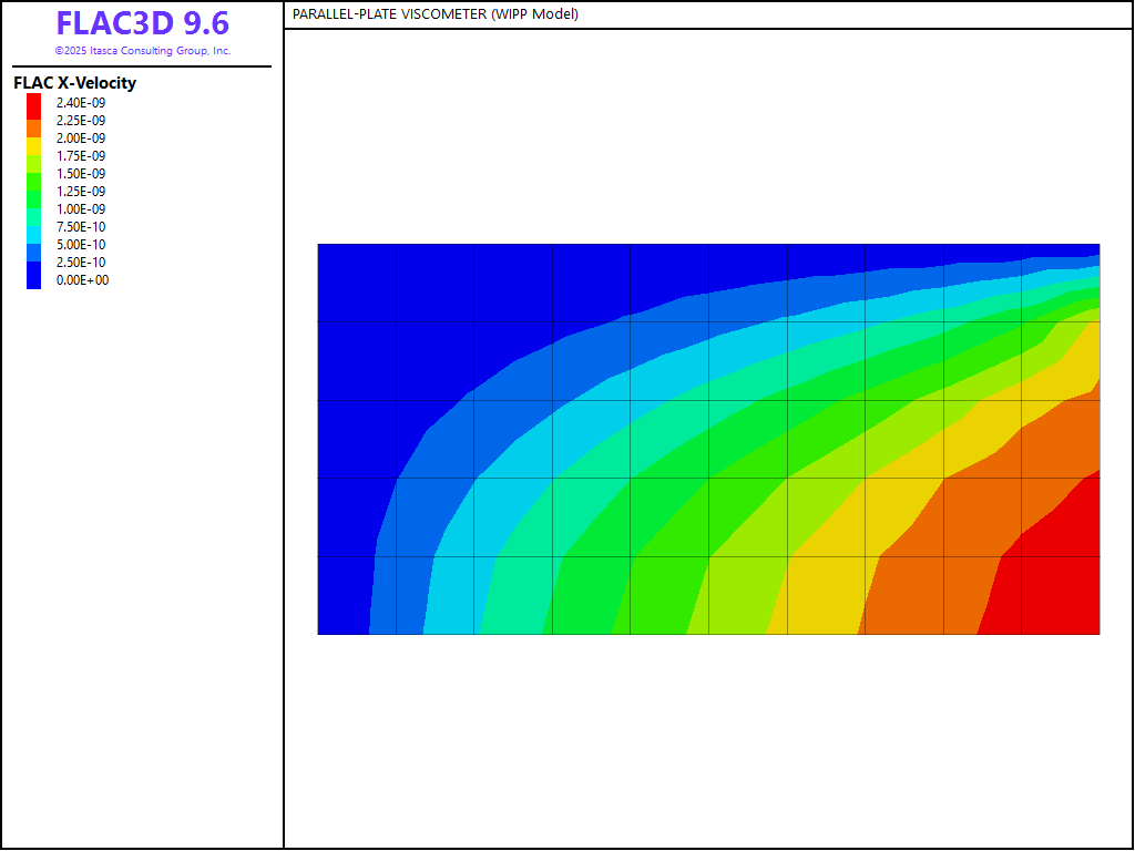 The parallel-plate viscometer test using the classical creep models is repeated to test the WIPP-type creep models (WIPP model, WIPP-Drucker model, and WIPP-Salt model). The analytical solution for the parallel-plate test assumes the viscosity is constant. In the WIPP-type creep models, the viscosity is dependent on the deviatoric stress, so a direct comparison cannot be made. As an alternative, the FLAC3D solution is compared to that obtained from the two-dimensional program, FLAC. The FLAC3D model uses the same grid as that shown and the same boundary conditions as those described in parallel-plate viscometer test using the classical creep models. The model can be directly compared to the FLAC model.