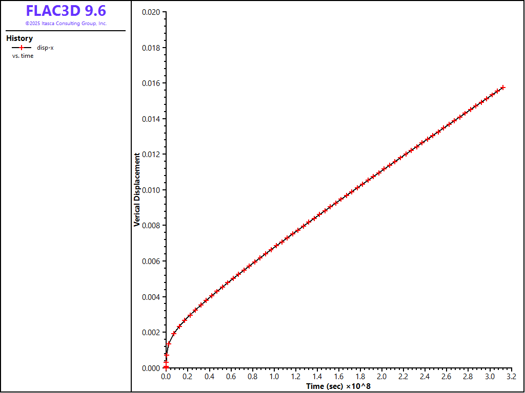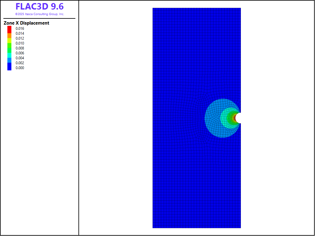 A horizontal circular cavern with a radius of 2 meters, located at the center right of the model domain, is excavated at t = 0 days, and the model is cycled to static equilibrium with the creep option disabled. Subsequently, the creep option is activated, and the model is run for 10 years. An automatic timestep scheme is employed, starting with a timestep of 1e−20 s and a maximum timestep of 1000 s. To ensure a gradual adjustment of the timestep, a lower multiplier of 1.002 and an upper multiplier of 0.998 are utilized. The horizontal drift at the utmost side point of the cavern wall is monitored throughout the simulation. Figure 1 plots the horizontal drift at the utmost side point of the cavern wall throughout 10 years. Figure 2 presents the horizontal displacement contour at t = 5 years.