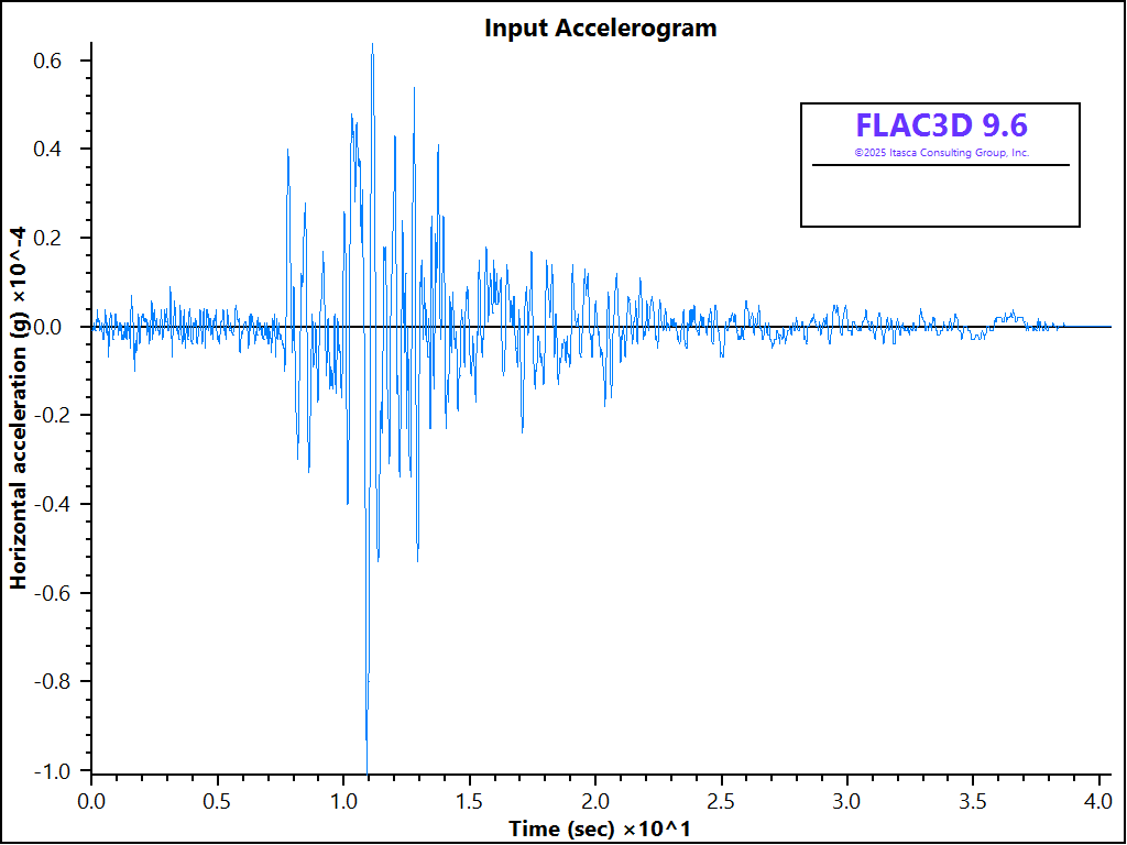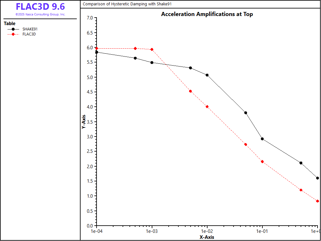 FLAC3D model with hysteretic damping — A 1D column FLAC3D model composed of 30 cubic zones, each with a depth of 5 feet (1.524 m), is assigned the soil properties listed in Table 1. Model conditions are prescribed to simulate the free-field motion of a layered soil deposit with a rigid base. The horizontal acceleration record is applied as an input boundary condition at the base of the model. FLAC3D takes the scaled base motion from SHAKE-91. For example, note that the input table “Diam-flac-0001.acc” is scaled with a maximum value of 0.0001 g. Vertical movement is prevented in the model.