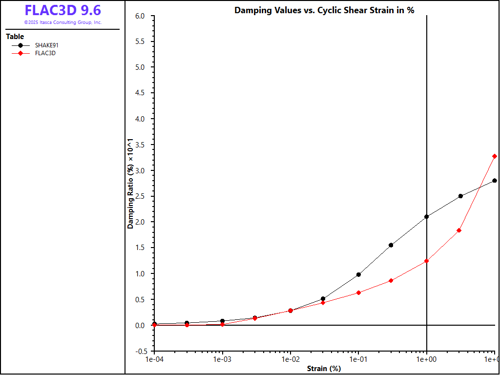 Figure 4: Damping ratio curve for FLAC3D default model versus dynamic property set 1 (Seed & Sun data — clay — “upper range”).