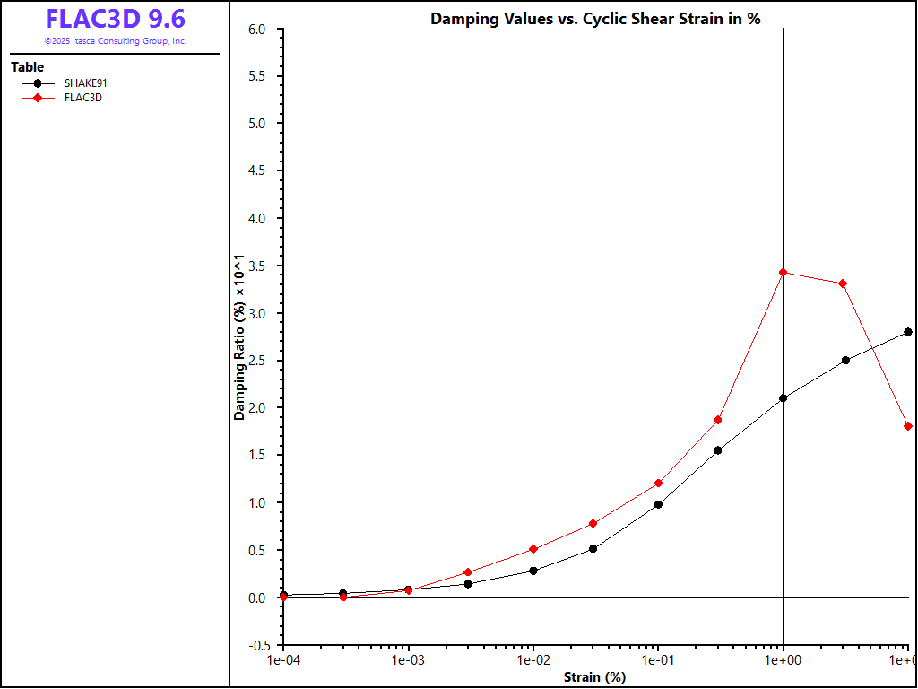 Figure 2: Damping ratio curve for FLAC3D default model versus dynamic property set 2 (Seed & Idriss data — sand — “upper range”).